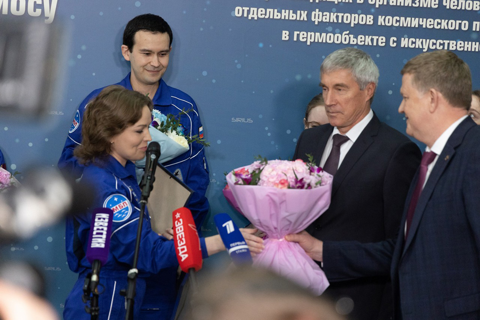 Ксении Шишениной (Россия) и Рустама Зарипова (Россия) вышли из экспериментального модуля медико-технического Наземного экспериментального комплекса (НЭК) ИМБП. В торжественной обстановке экипаж встречали: