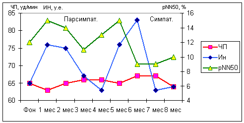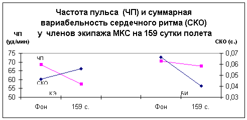 В ходе полета наблюдается снижение частоты пульса и рост активности парасимпатического звена регуляции (RMSSD). На 1-м и 3- 4-м месяцах полета растет активность сосудистого звена регуляции (LF), которая чередуется с ростом активности энерго - метаболического звена регуляции (VLF) – на 2-м и 5-6-м месяцах полета. Создается впечатление, что процесс адаптационной перенастройки регуляторных механизмов, во-первых, является волнообразным с длительностью периодов равной 1-3-месяцам, и, во-вторых, протекает путем активации все более высоких уровней регуляции.