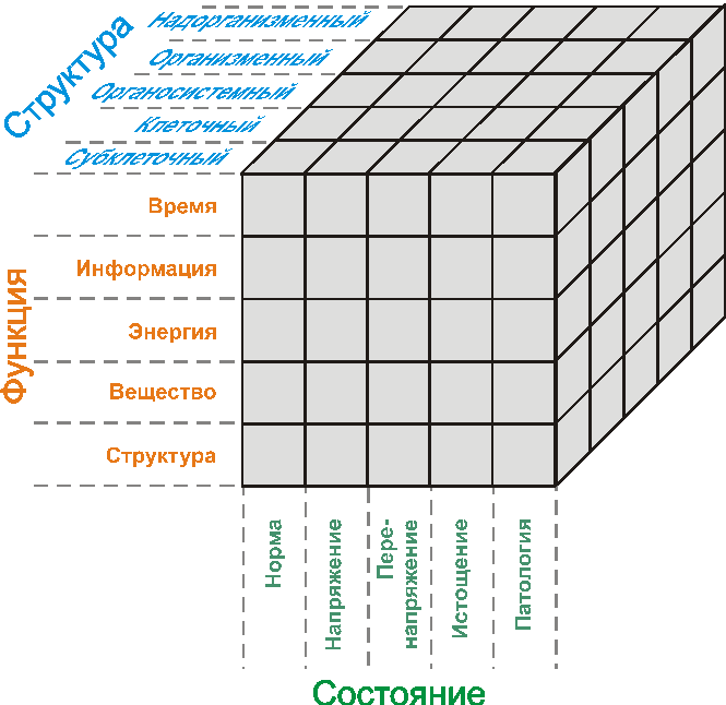 Сложная функциональная система – живой организм - формируется на основе системообразующего фактора из множества компонентов с беспорядочным взаимодействием (П.К. Анохин, 1973). Для любой системы таким фактором является конкретный результат ее деятельности. Следовательно, в функциональной системе “структура-функция-состояние” в качестве системообразующего фактора можно рассматривать “состояние”. В представленной на рис. 2 трехмерной модели живой системы одной их координат является функциональное состояние организма, две другие координаты образуют структура и функция. Структура живых систем - это специфическая эволюционно и генетически обусловленная иерархия все более сложных материальных субстратов, представляющих собой основу для развертывания жизненных функций. Существует большое число разнообразных классификаций структурных единиц живой системы. Мы выбрали наиболее часто применяемую классификацию, включающую пять уровней: субклеточный, клеточный, органно-системный, организменный и надорганизменный (М.И. Сетров, 1971). Функция живой системы – это способ поведения, в результате которого обеспечивается поддержание целостности структур и который включает в себя последовательные уровни организации обмена веществ, обмена энергией и информацией и процессы временной организации.