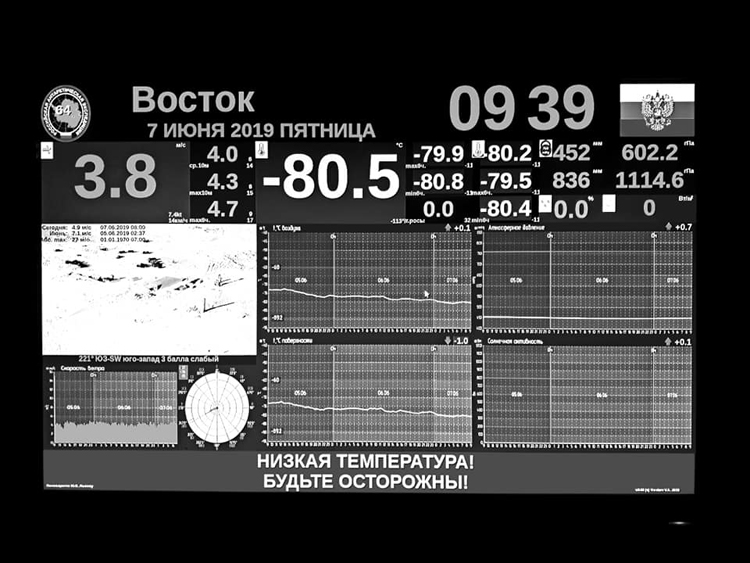 Well, we have the temperature here of -80.5 ° Celcius. It is the coldest temperature that I've ever experienced in my life. That would be a thing to remember. At the temperature lower then -70 °C the properties of most metals change towards fragility yet we here are carrying out our duties and maintain mental and physical durability. Humans are stronger than nature.