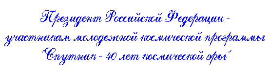 Приветствую участников первой в истории международной молодежной программы "Спутник – 40 лет космической эры", выполненной школьниками России и Франции.