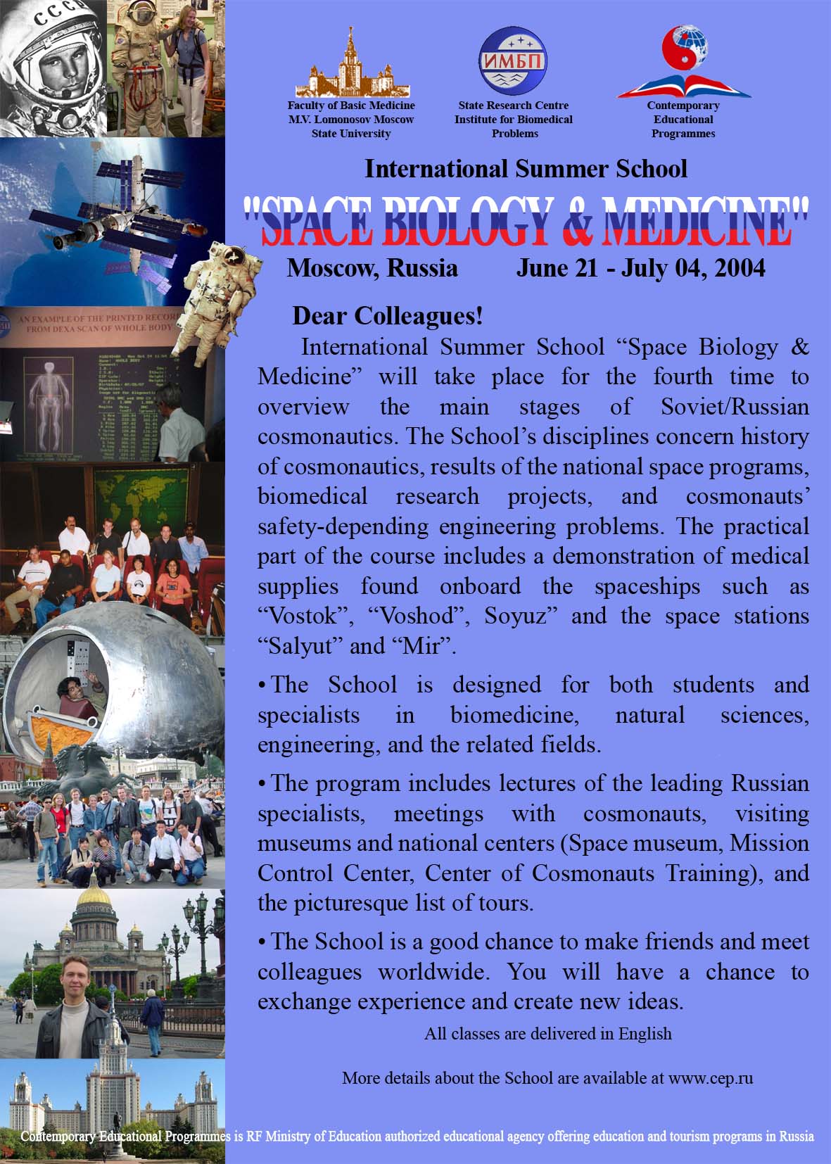 Dear Colleagues, The school is a joint project of Faculty of Basic Medicine of the Lomonosov Moscow State University, Institute of Biomedical Problems of the Russian Academy of Sciences, and our company (national educational agency). The School will take place for a fourth time to overview the main stages of Soviet/Russian cosmonautics. The main topics concern history of cosmonautics, results of the national space programs, biomedical research projects, and cosmonauts' safety-dependent engineering problems. The practical part of the course includes a demonstration of medical supplies found onboard spaceships such as "Vostok", "Voshod", "Soyuz" and the space stations "Saljut" and "Mir".