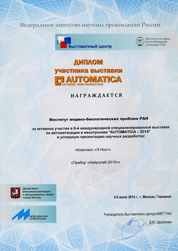 С 3 по 6 июня 2014 года в г. Мюнхен, Германия проходила 6-ая Международная специализированная выставка «Automatica-2014». На стенде Правительства Москвы были представлены совместные с немецкими партнерами – фирмами «Airbus Defence & Space» и «KORALEWSKI» разработки «Электронный Нос» (аппаратура, позволяющая определять наличие и идентифицировать микроорганизмы по их газовыделению) и «Нейролаб-2010» (аппаратура, позволяющая исследовать индивидуальные особенности психофизиологического регулирования состояния и надежности профессиональной деятельности космонавта в длительном космическом полете), используемые в Российской национальной программе на МКС. По итогам выставки Федеральное агентство научных организаций России наградило Институт дипломом за активное участие в выставке и успешную презентацию научных разработок «Электронный нос» и «Нейролаб-2010».