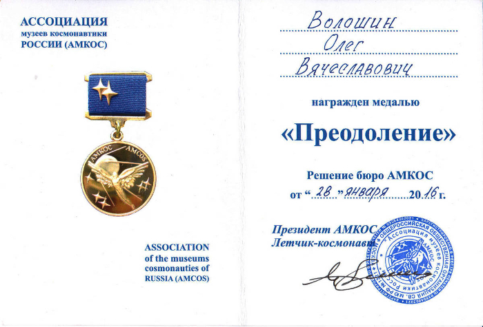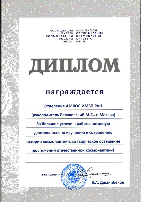 27-28 января 2016 года в Музее космонавтики г. Москвы прошли XL академические чтения по космонавтике и отчетно-выборная конференция Ассоциация музеев космонавтики России (АМКОС). За активную деятельность по изучению и сохранению истории космонавтики и творческое освещение достижений отечественной космонавтики отделение АМКОС ИМБП РАН (руководитель - Белаковский М.С.) было награждено дипломом, а пресс-секретарь ИМБП РАН - медалью "Преодоление".
