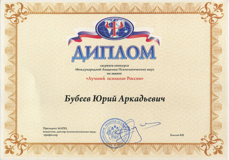 За значимый вклад в развитии психологии Президиум Международной Академии Психологических наук (МАПН) наградил Дипломом «Лучший психолог России» и Почетным знаком МАПН руководителя отдела психологии и психофизиологии Государственного научного центра — Института медико-биологических проблем РАН Бубеева Юрия Аркадьевича.