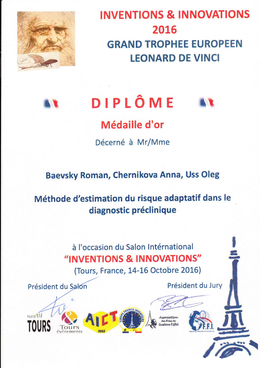 1. «Способ оценки адаптационного риска в донозологической диагностике» (авторы: Баевский Р.М., Черникова А.Г., Усс О.И., патент РФ № 2586041) - Золотая медаль и Диплом.