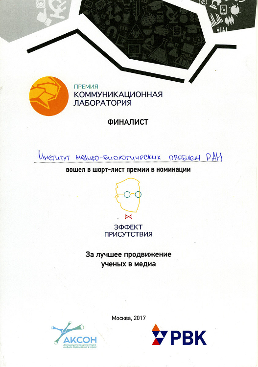 Институт медико-биологических проблем (ИМБП) РАН вошел в шорт-лист и получил дипломы финалистов конкурса по двум номинациям – «За лучшее продвижение ученых в медиа» и «За высокие стандарты качества коммуникационной работы небольших коммуникационных команд (малый Гран-при)».