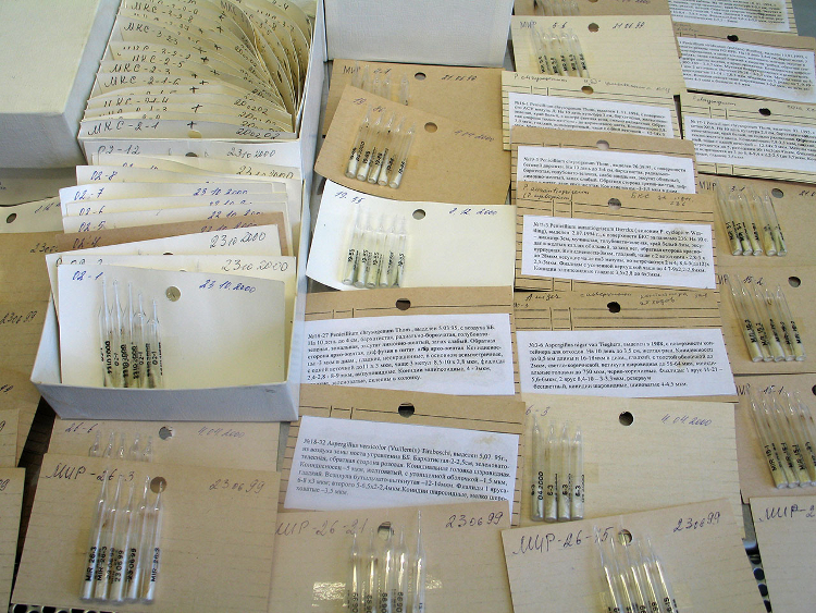 Все эти направления работ диктовали необходимость создания и использования коллекции “полетных штаммов” - биодеструкторов, предназначенной для испытания образцов новой космической техники и новых средств антимикробной защиты. Коллекция микромицетов, выделенных из среды обитания космических станций, ведется в Институте с 1988 года. Первые сохраненные штаммы грибов изолированы с поверхности иллюминатора спускаемого аппарата в период работы третей экспедиции на станции МИР. С тех пор коллекция значительно расширилась и в настоящее время включает более 500 штаммов мицелиальных грибов.