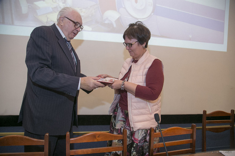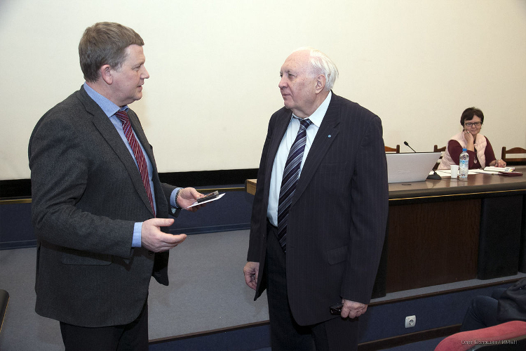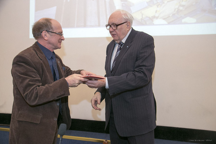 По завершению доклада председатель совместного заседания академик РАН Орлов О.И. от имени ИМБП и по поручению Федерации космонавтики России вручил профессору Бармину И.В. памятную медаль за заслуги перед космонавтикой им. академика О.Г. Газенко.