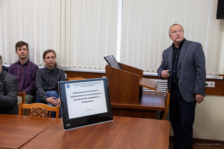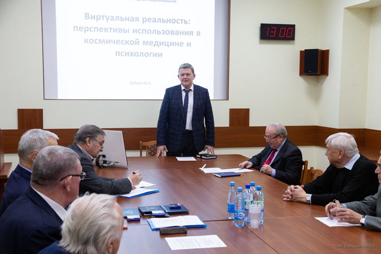 Заседания продолжил руководитель отдела психологии и психофизиологии ИМБП профессор Юрий Аркадьевич Бубеев с докладом о перспективах использования виртуальной реальности в космической медицине и психологии.