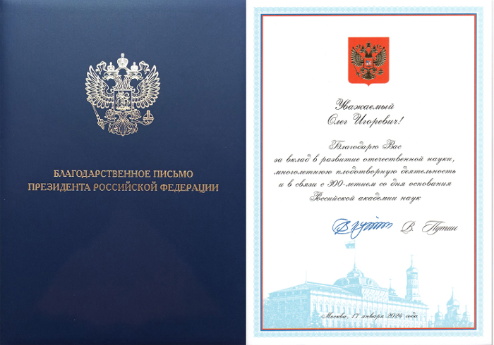 30 января 2024 года на заседании Президиума Российской академии наук президент РАН Красников Г.Я. вручил