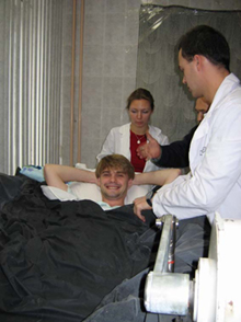- 12-го сентября начался эксперимент, посвященный исследованию влияний механостимуляции опорных зон стопы на выраженность эффектов моделируемой микрогравитации в центральных и периферических звеньях двигательной системы. В качестве модели гипогравитации используется сухая иммерсия, длительность иммерсионного воздействия - 3 суток. В одной из серий в ходе иммерсии используется механостимуляция опорных зон стопы: в течение 6 часов по 30 минут каждый час стимулируются опорные зоны стопы в режиме медленной и быстрой локомоции. Для стимуляции используется аппаратура - компенсатор опорной разгрузки - разработанная совместно сотрудниками отдела и ОАО НПП "Звезда". До и после иммерсии исследуются: скоростно-силовые, жесткостные и электромиографические характеристики мышц голени и бедра, электроэнцефалографические показатели, сопровождающие саккадические движения глаз, и характеристики глазодвигательного и моторного слежения. Одновременно в ходе эксперимента проводятся испытания бортовых методов определения длины позвоночника, а также клинической версии костюма аксиального нагружения "Регент".