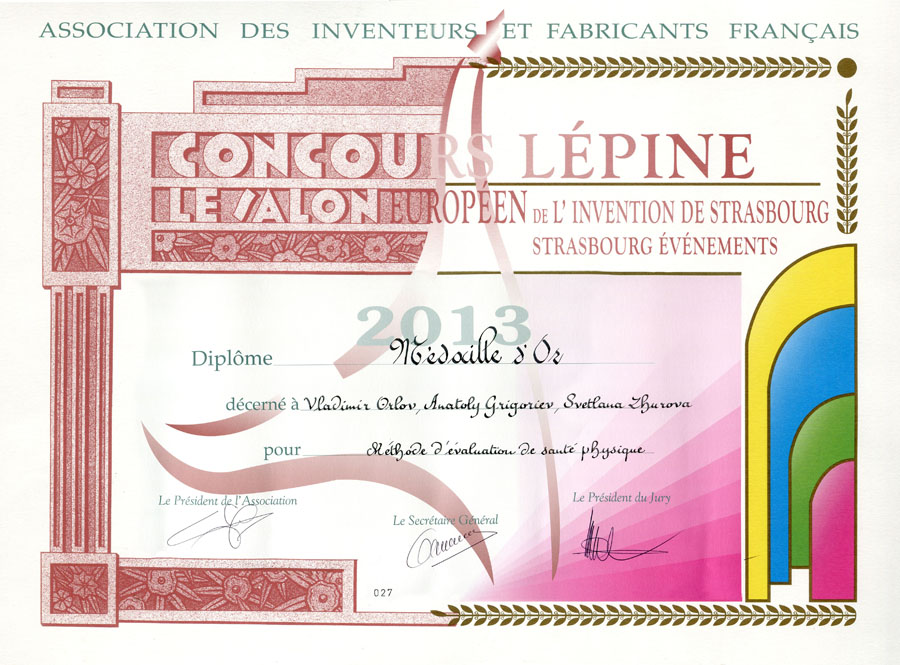- Способ оценки резервов физического здоровья и работоспособности населения (авторы: Григорьев А.И., Орлов В.А., Журова С.В.) – Золотая медаль, Диплом.