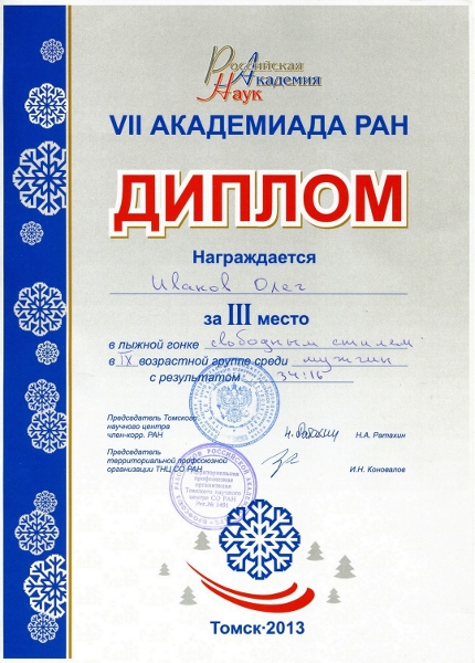 В составе объединенной команды Профсоюза работников РАН г. Москвы, состоящей из 4-х человек, принял участие сотрудник Института инженер отдела ВРПД Иванов О.Г. В первый день соревнований в гонке на дистанции 10 км классическим стилем он занял 4-е место.