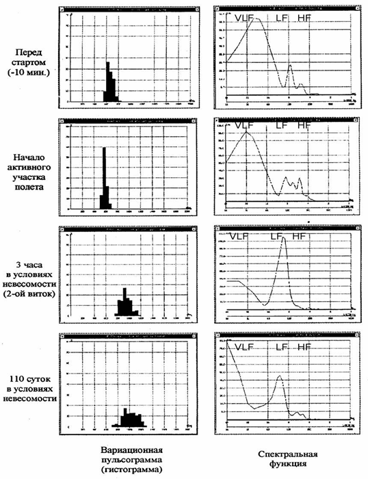 В ходе полета наблюдается снижение частоты пульса и рост активности парасимпатического звена регуляции (RMSSD). На 1-м и 3- 4-м месяцах полета растет активность сосудистого звена регуляции (LF), которая чередуется с ростом активности энерго - метаболического звена регуляции (VLF) – на 2-м и 5-6-м месяцах полета. Создается впечатление, что процесс адаптационной перенастройки регуляторных механизмов, во-первых, является волнообразным с длительностью периодов равной 1-3-месяцам, и, во-вторых, протекает путем активации все более высоких уровней регуляции.