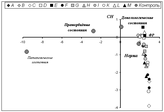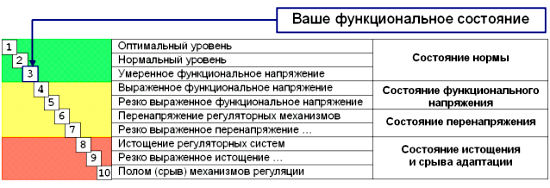 Представленная классификация функциональных состояний характеризует четыре уровня здоровья, четыре уровня адаптационных возможностей организма. Здесь существенно важным является то, что неопределенное понятие пограничных состояний получает конкретный смысл на основе представлений об адаптации и гомеостазе. Как видно из рис.1, в рамках этой упрощенной схемы была создана достаточно тонко дифференцированная 10-балльная шкала функциональных состояний (“лестница состояний”), которая в терминах степени напряжения регуляторных систем позволяет давать оценку и прогноз функциональных состояний организма, пограничных между нормой и патологией.