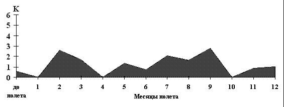 Рис. 14. Степень активации высших вегетативных центров (по значениям коэффициента К) в 14 месячном космическом полете.