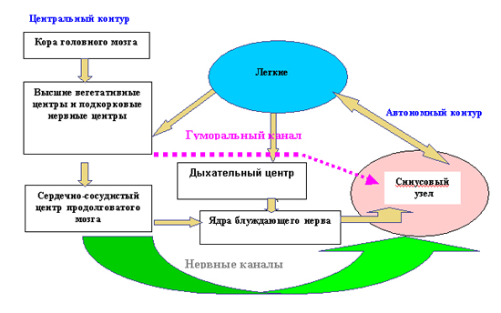 Деятельность центрального контура регуляции, который идентифицируется с симпатоадреналовыми влияниями на ритм сердца, связана с недыхательной синусовой аритмией (СА) и характеризуется различными медленноволновыми составляющими сердечного ритма. Прямая связь между центральным и автономным контурами осуществляется через нервные (в основном симпатические) и гуморальные связи. Обратная связь обеспечивается афферентной импульсацией с барорецепторов сердца и сосудов, хеморецепторов и обширных рецепторных зон различных органов и тканей.