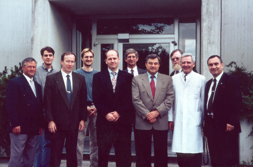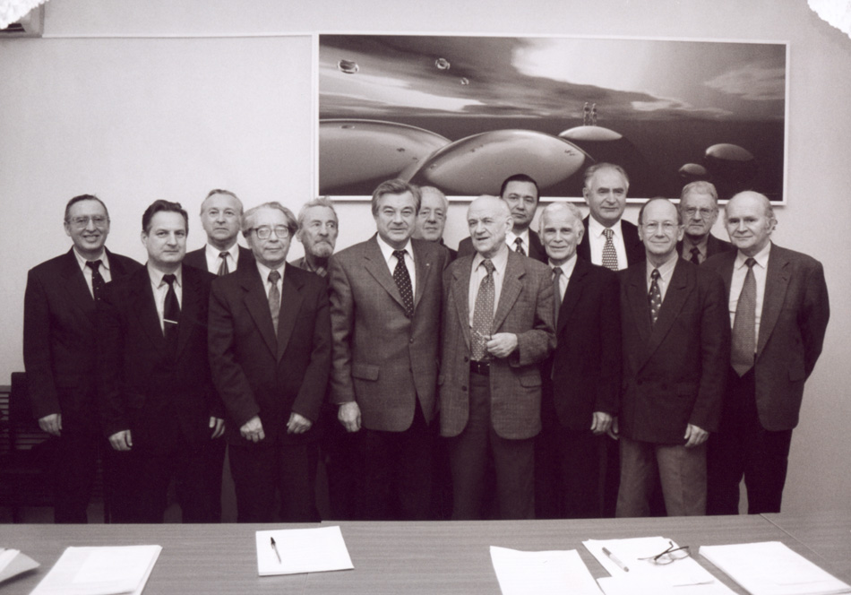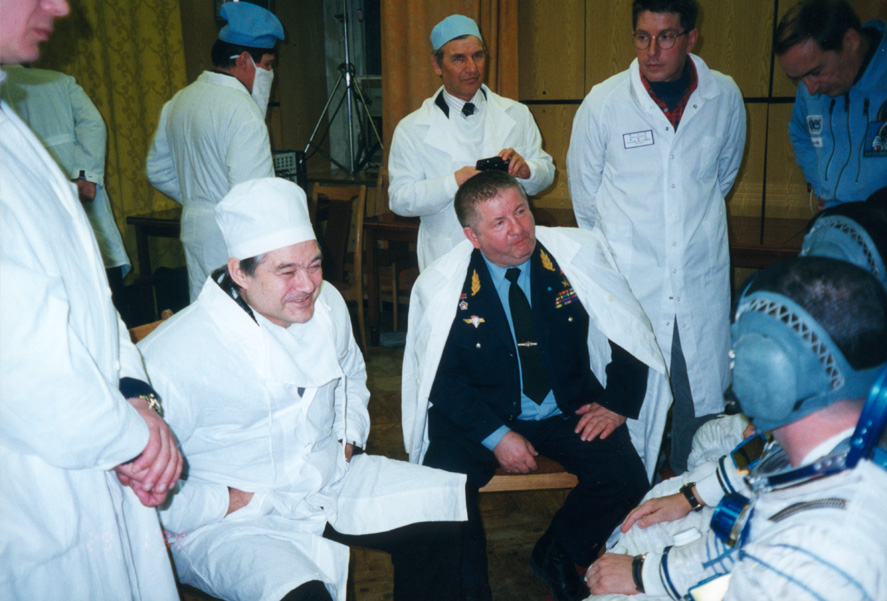 Председатель Главной медицинской комиссии А.И.Григорьев дает напутствие перед космическим стартом (1995) Участники симпозиума "Медицина в космосе" в Университете им. Людвига-Максимилиана. Мюнхен, Германия (1996)