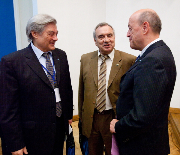 А.И. Григорьев, космонавт В.В. Поляков и генеральный секретарь Международной академии астронавтики Ж-М Контан.
