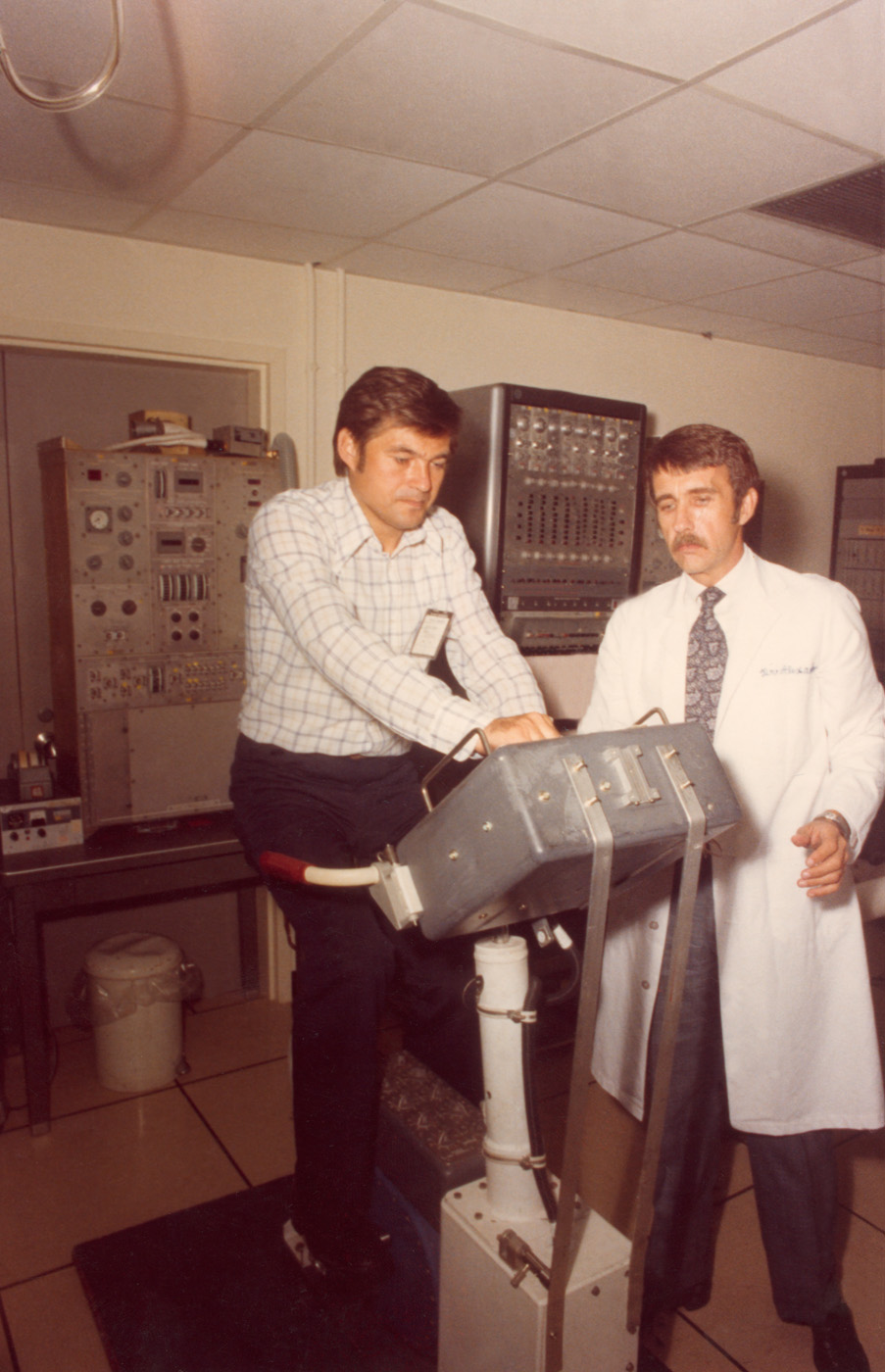 А.И.Григорьев в Космическом центре им. Л.Джонсона (NASA, Хьюстон, США) испытывает с американским коллегой модель велотренажера для перспективной орбитальной станции (1979)