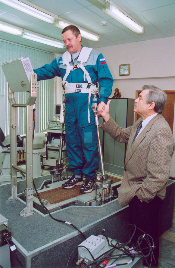 А.И.Григорьев и космонавт Т.Мусабаев, успешно завершивший космический полет, в гостинице Звездного городка (1998) А.И.Григорьев и врач-космонавт Б.В.Моруков во время испытания бегущей дорожки для Международной космической станции (2002).